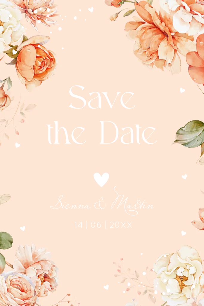 Save the Date uitnodiging met watercolour bloemen peach. Maak jullie trouwdatum bekend met deze romantische save the date!