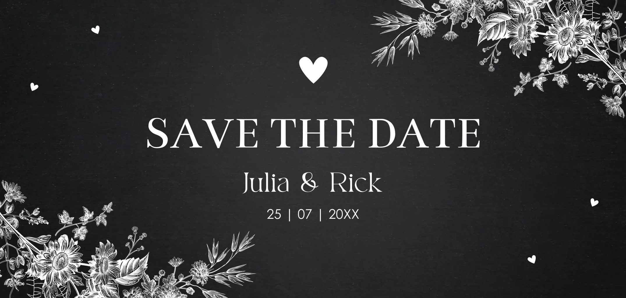 Save the Date kaart zwart botanisch bloemen wit panorama hartjes