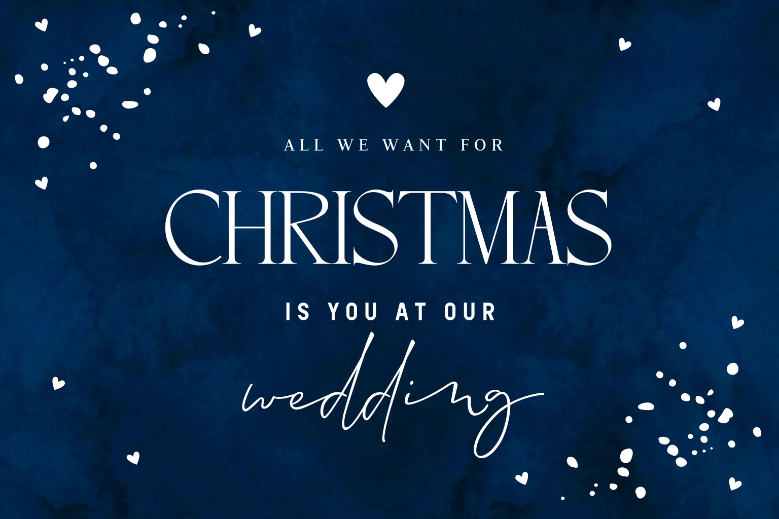Stijlvolle Save the Date kerstkaart donkerblauw met hartje, spetters en goudfolie. Maak jullie trouwdatum bekend met deze prachtige save the date uitnodiging.