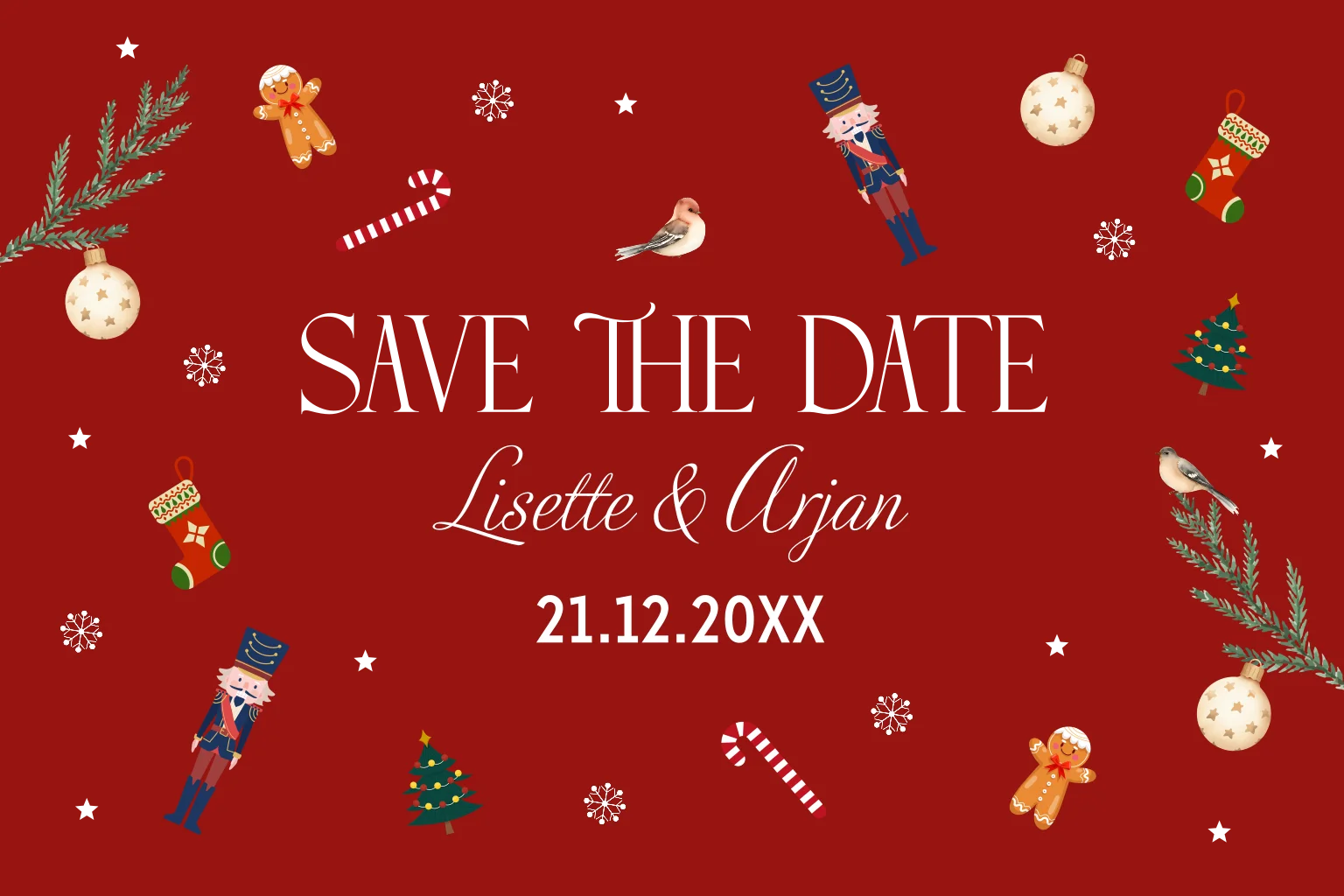 Save the Date kerstkaart rood met leuke kerstfiguurtjes en luxe goudfolie. Maak jullie trouwdatum bekend met deze originele Save the Date uitnodiging!