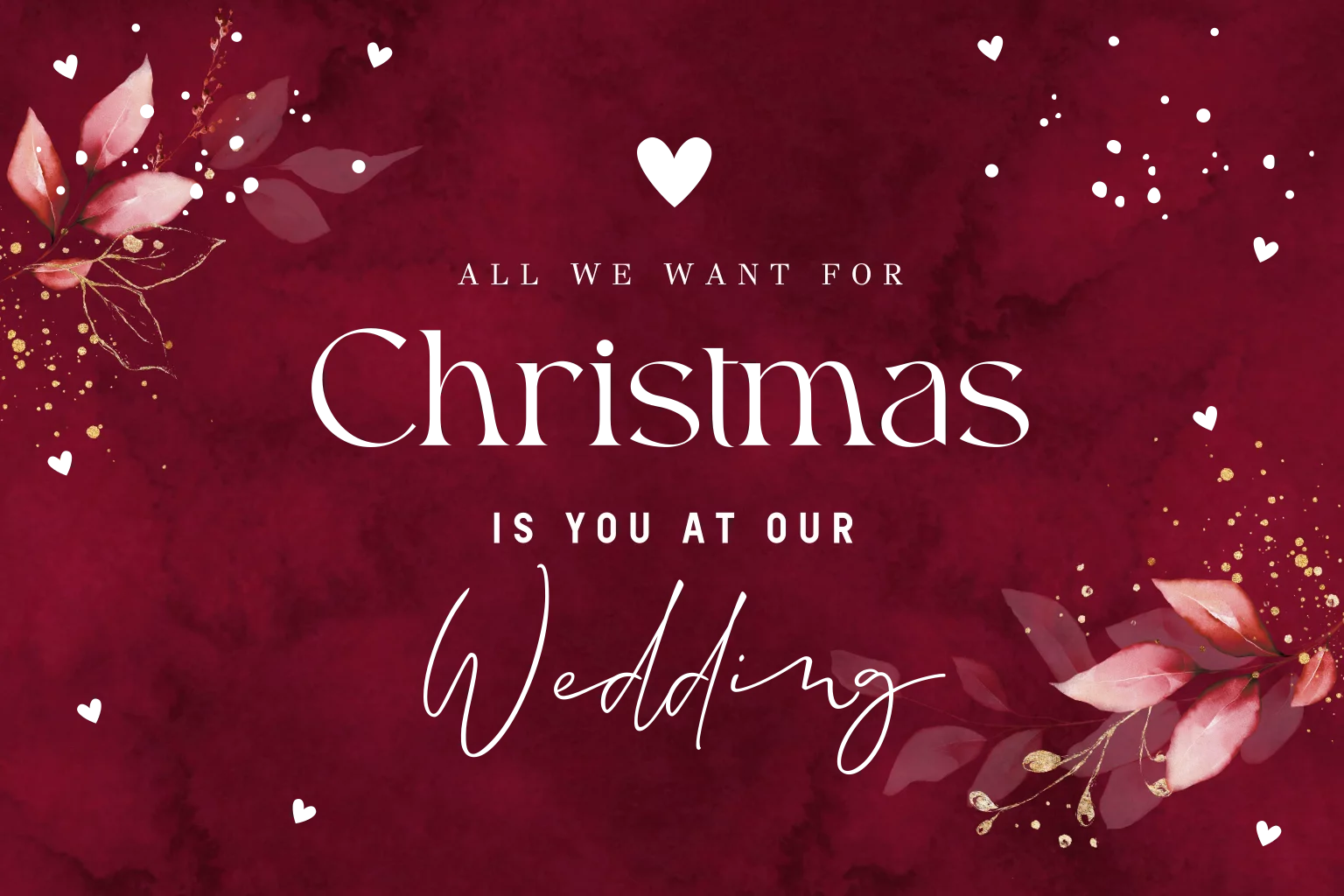 Mooie stijlvolle Save the Date kerstkaart rood met botanische bladeren, lampjes en goudfolie. Maak jullie trouwdatum bekend met een save the date kaart en kerstkaart in één!