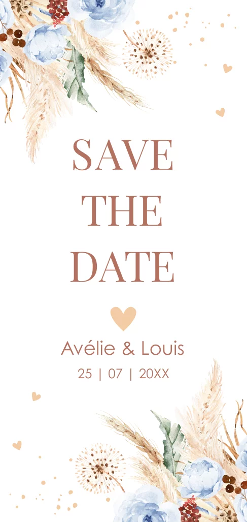 Save the Date kaart langwerpig blauw met watercolour bohemian bloemen. Stuur deze mooie Save the Date kaart naar jullie gasten om de trouwdatum bekend te maken.