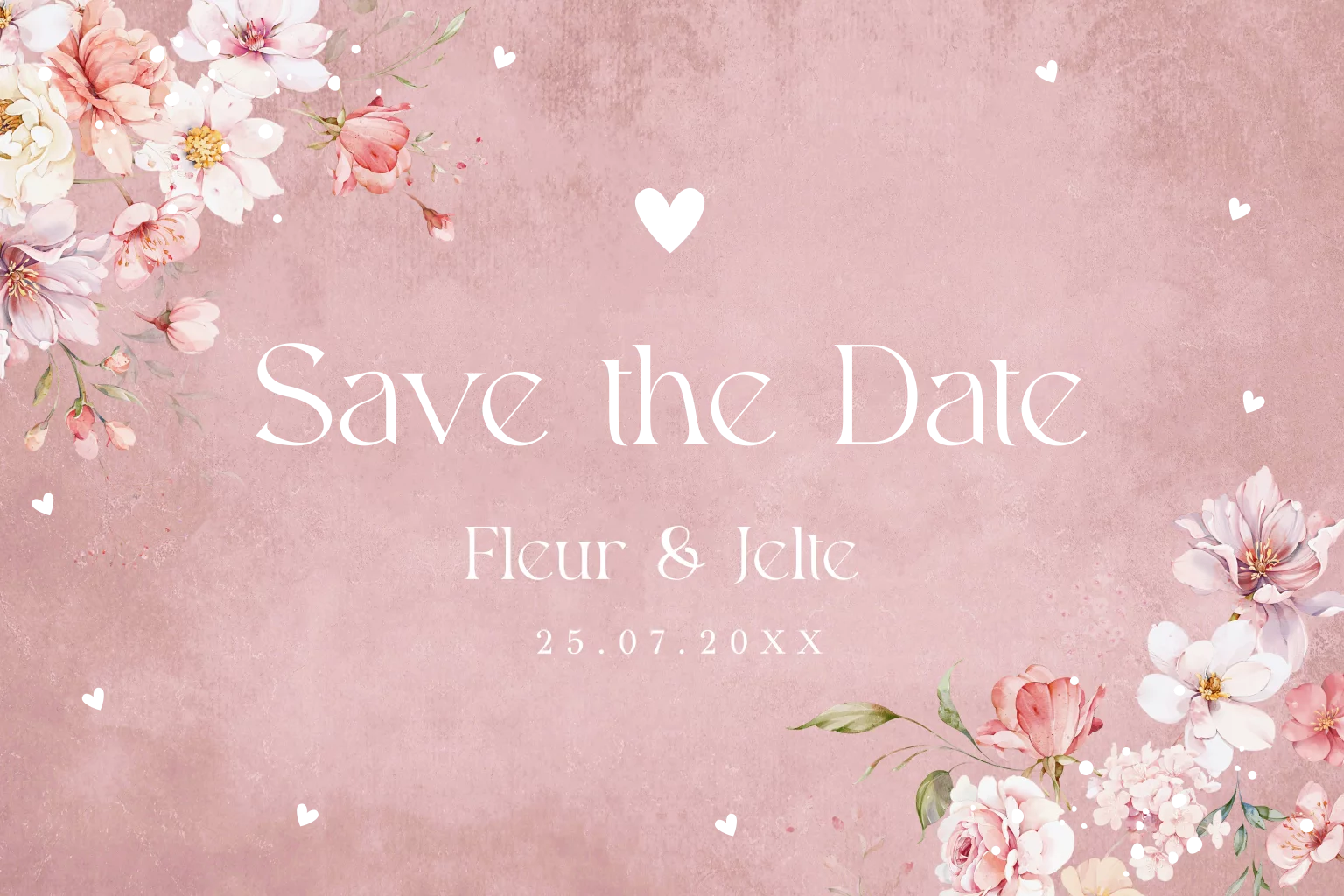 Save the Date uitnodiging bloemen oudroze dusty pink goudfolie