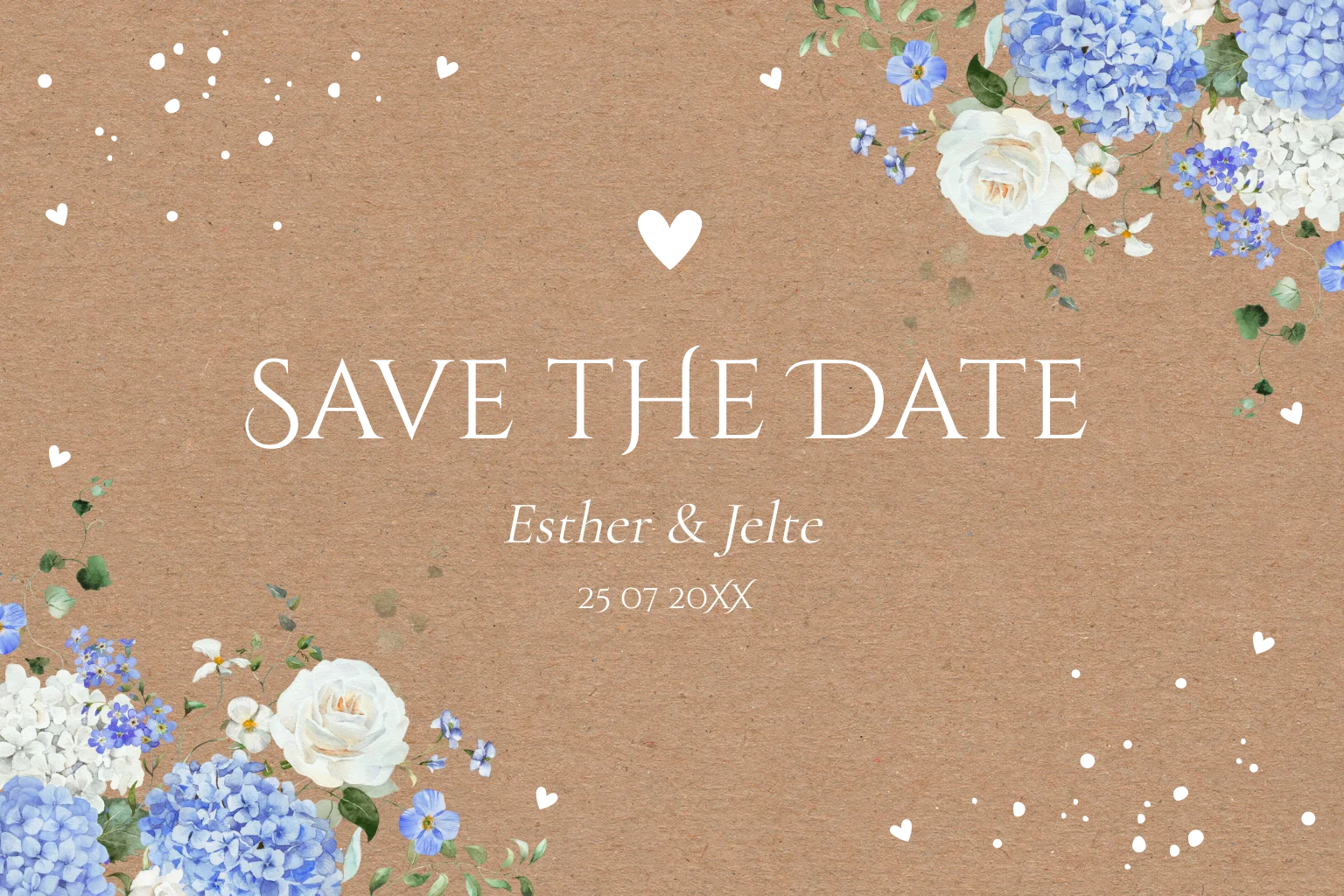 Landelijke Save the Date kaart met bloemen blauw wit, kraftlook en goudfolie. Maak jullie trouwdatum bekend met deze prachtige Save the Date kaart!