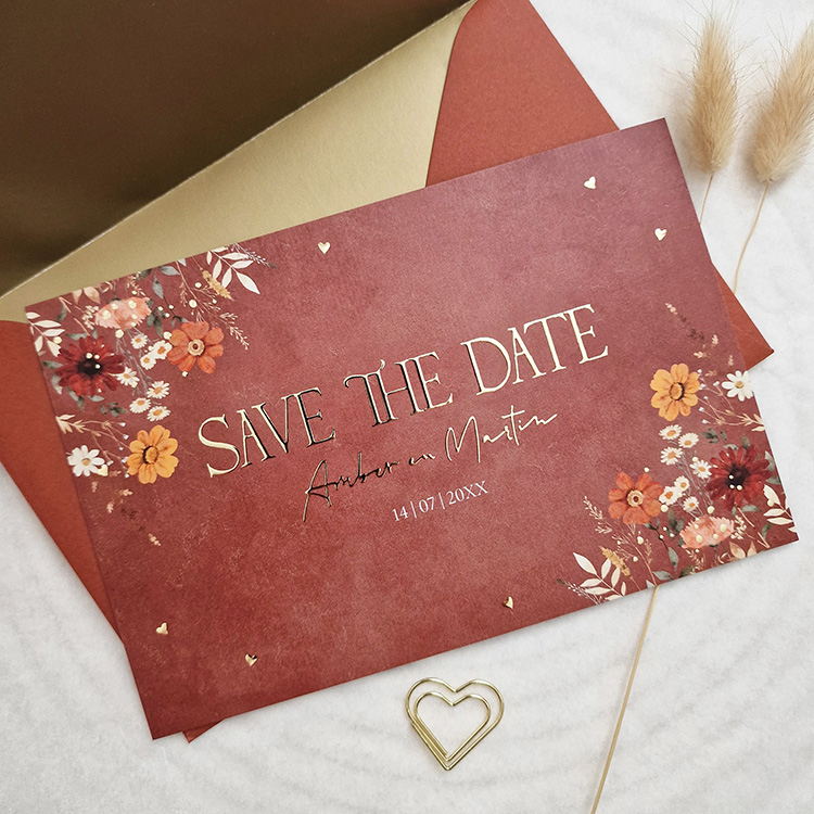 Save the Date kaart roestbruin herfst bloemen goudfolie