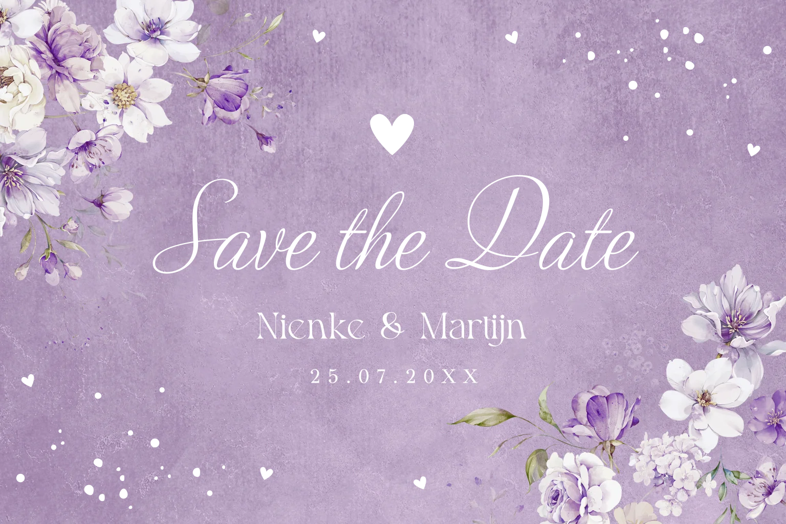 Romantische save the date kaart paars met bloemen en goudfolie. Maak jullie trouwdatum bekend met deze prachtige stijlvolle save the date!