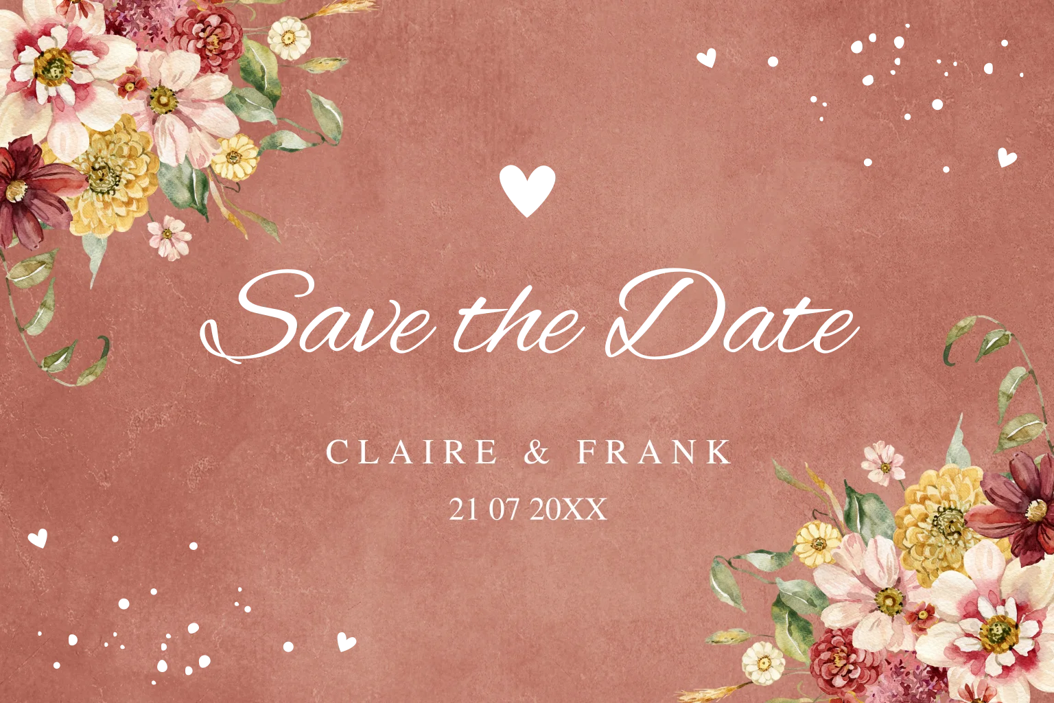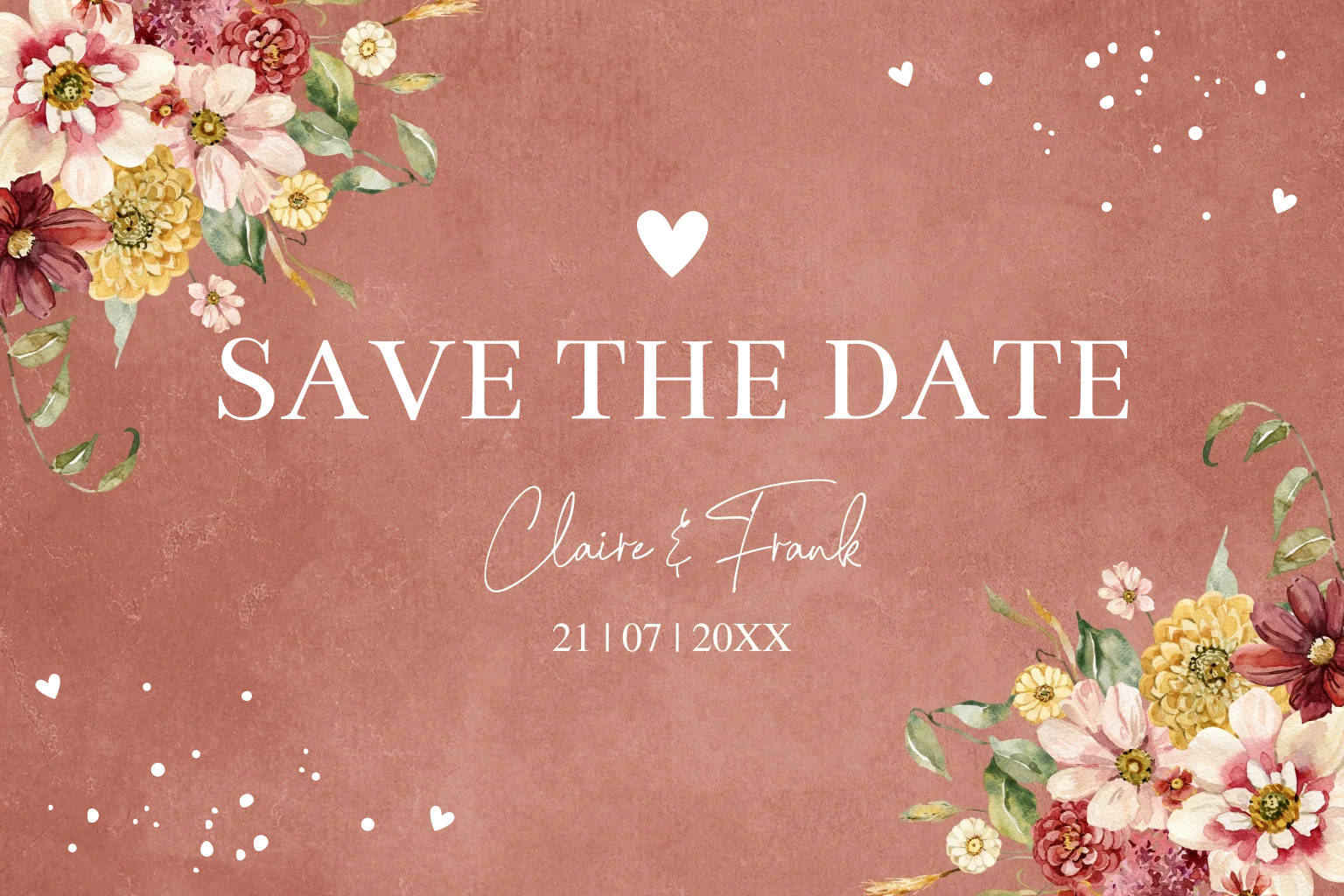 Stijlvolle originele Save the Date kaart met gekleurde bloemen en luxe goudfolie.