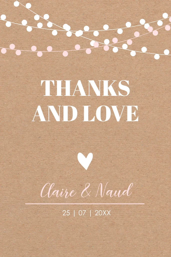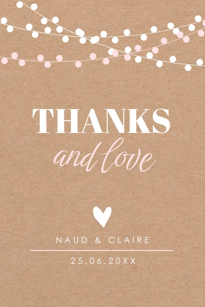 Stijlvolle bedankkaart huwelijk kraft look met roze en witte slingers. Bedank jullie gasten voor een onvergetelijke dag met deze prachtige bedankkaart.