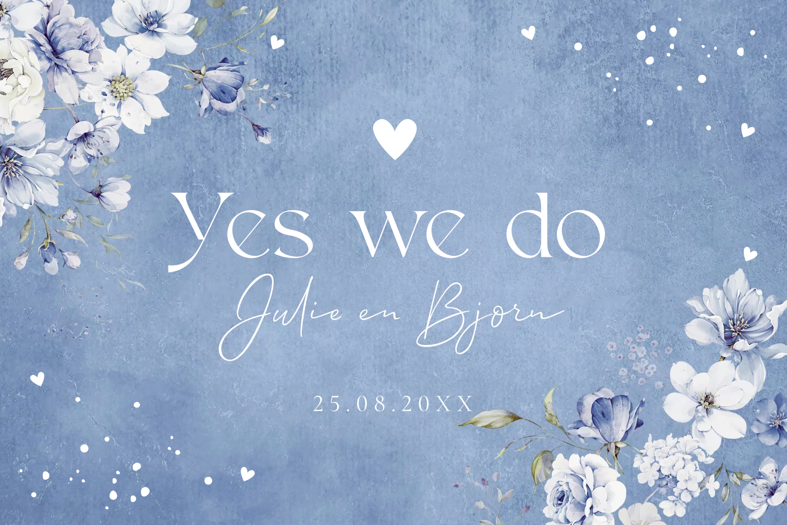 Trouwkaart blauw bloemen goudfolie rechthoekig
