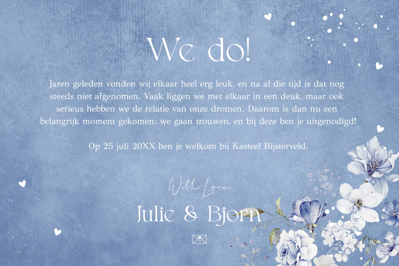 Stijlvolle trouwkaart blauw met romantische bloemen en goudfolie. Nodig jullie gasten uit met deze prachtige romantische luxe trouwkaart.