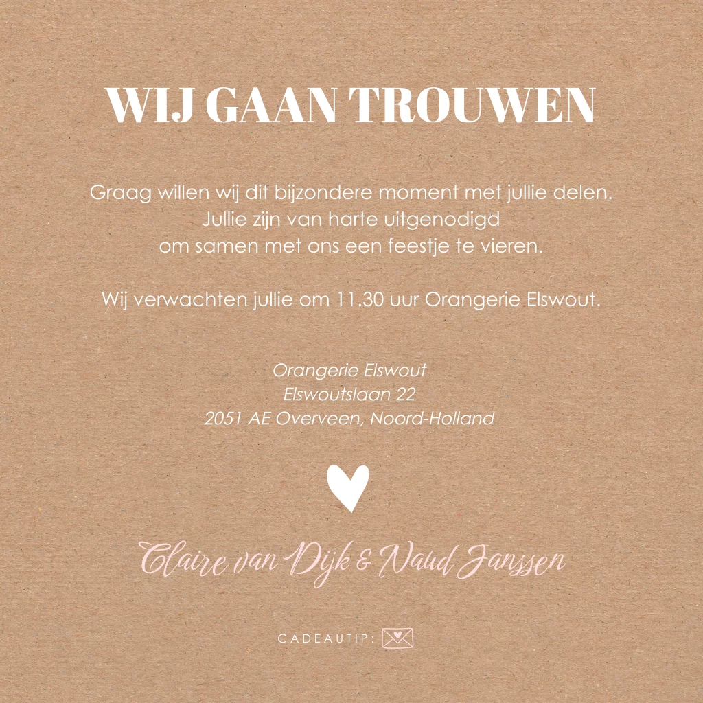 Stijlvolle trouwkaart met slingers wit roze met kraft look. Pas de kleuren naar wens aan in de editor.