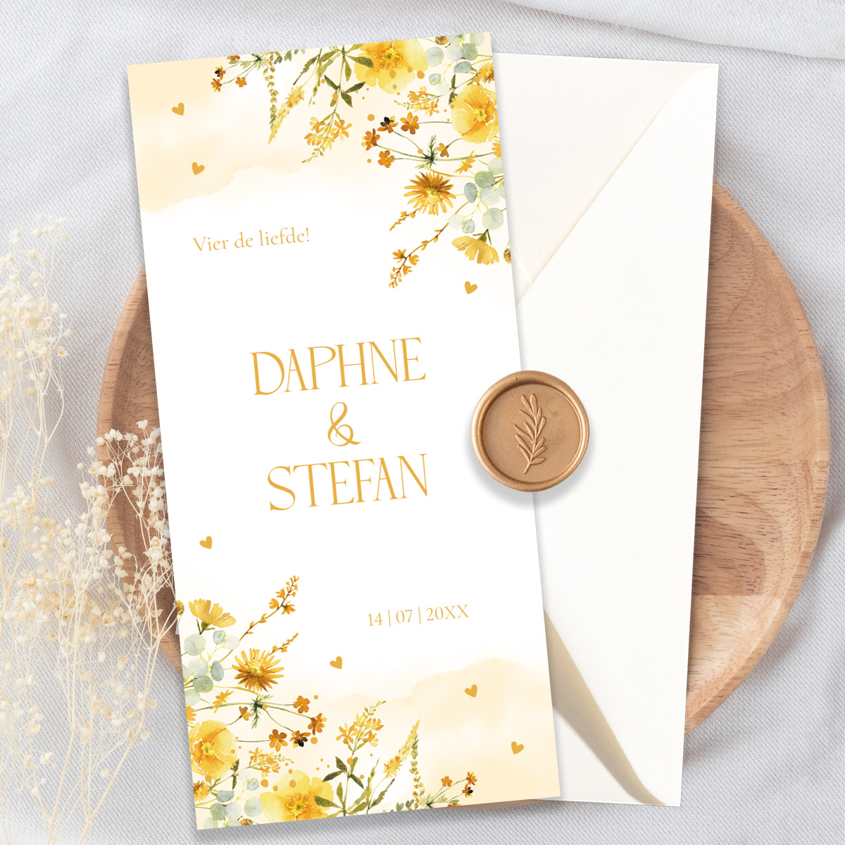 Een elegante trouwkaart met watercolour gele bloemen. Deze trouwuitnodiging heeft een langwerpige vorm. Liever de teksten in een andere kleur of hoogglans? In de editor pas je gemakkelijk de teksten en kleuren aan. Zo ontwerp je altijd een persoonlijke trouwkaart.