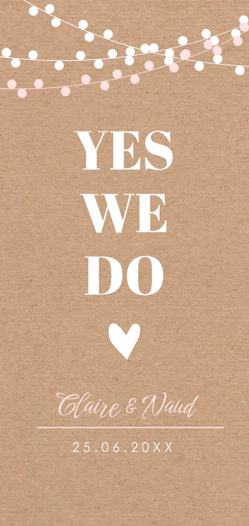 Stijlvolle trouwkaart langwerpig met roze en witte slingers met kraft look.