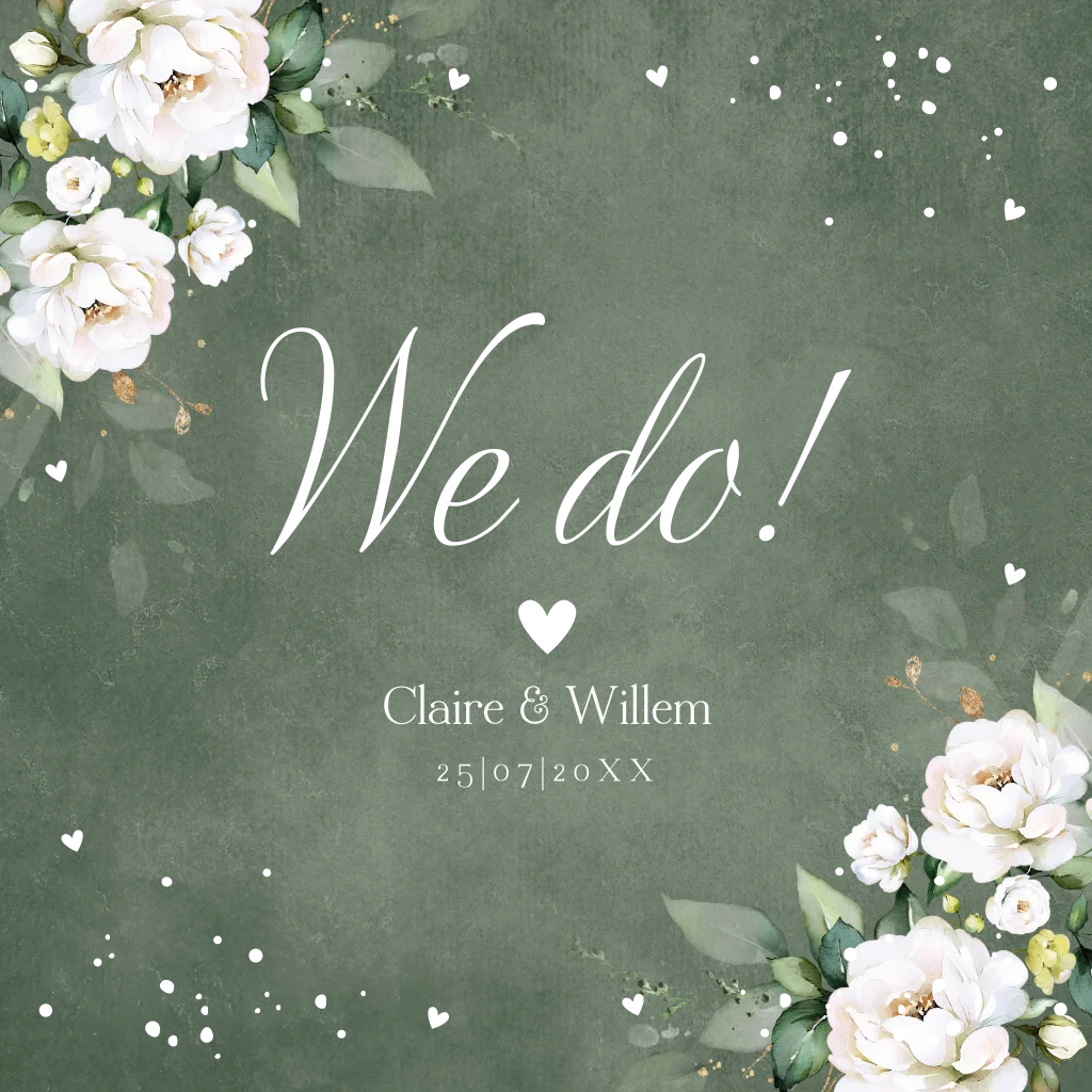 Stijlvolle originele trouwkaart botanisch groen met witte bloemen en goudfolie.