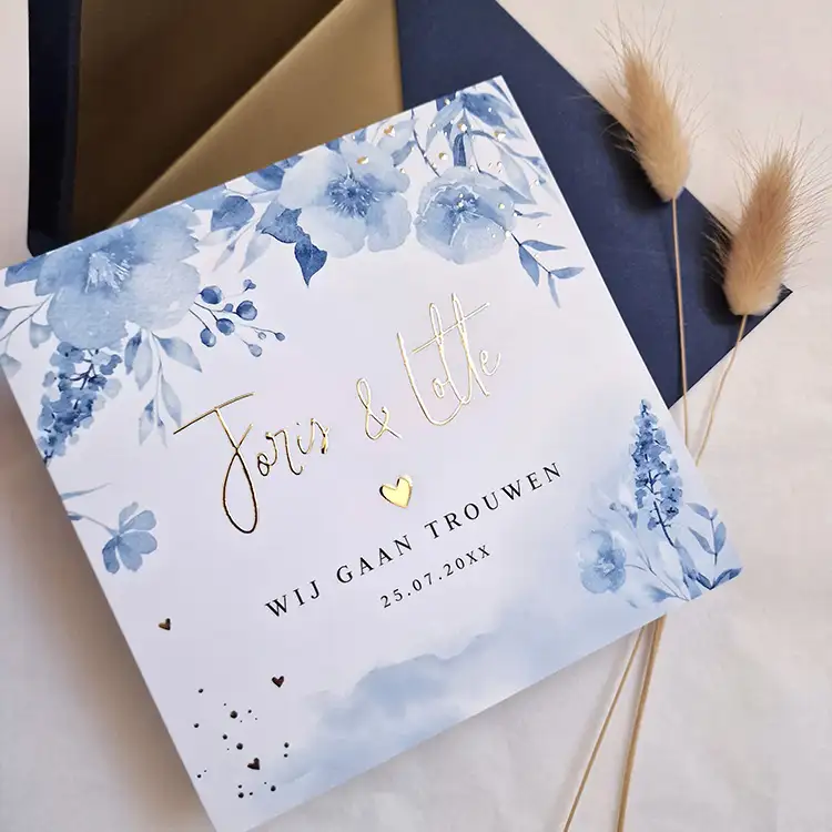 Trouwkaart bloemen blauw watercolour goudfolie vierkant