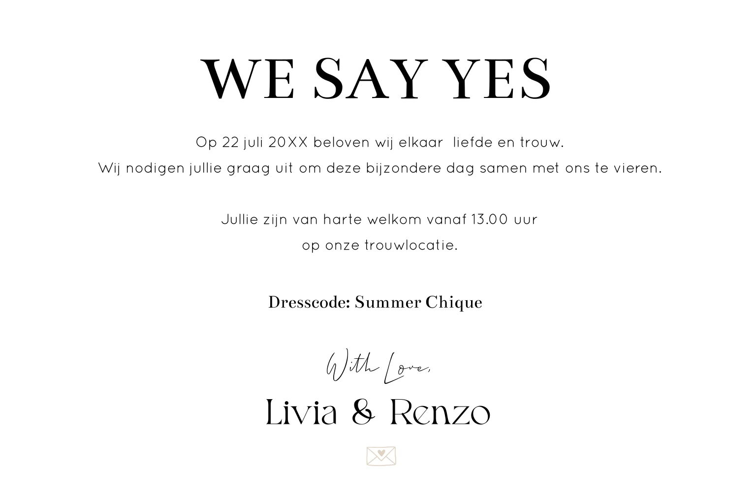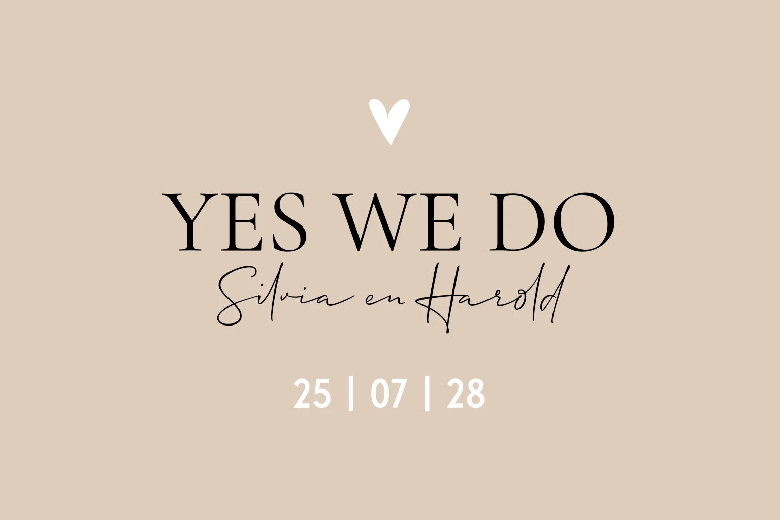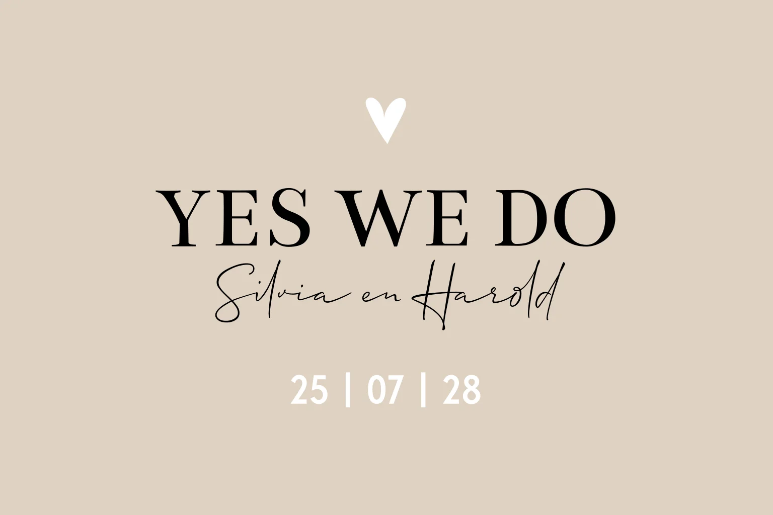 Stijlvolle trouwkaart rechthoekig beige met typografie en hartje.