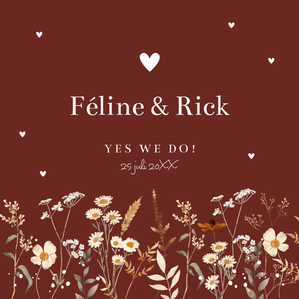 Stijlvolle trouwkaart rood met veldbloemen en goudfolie.