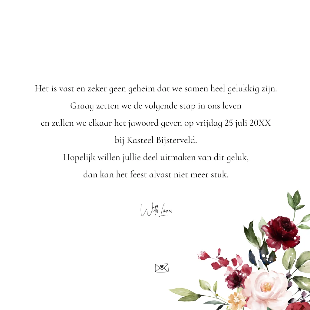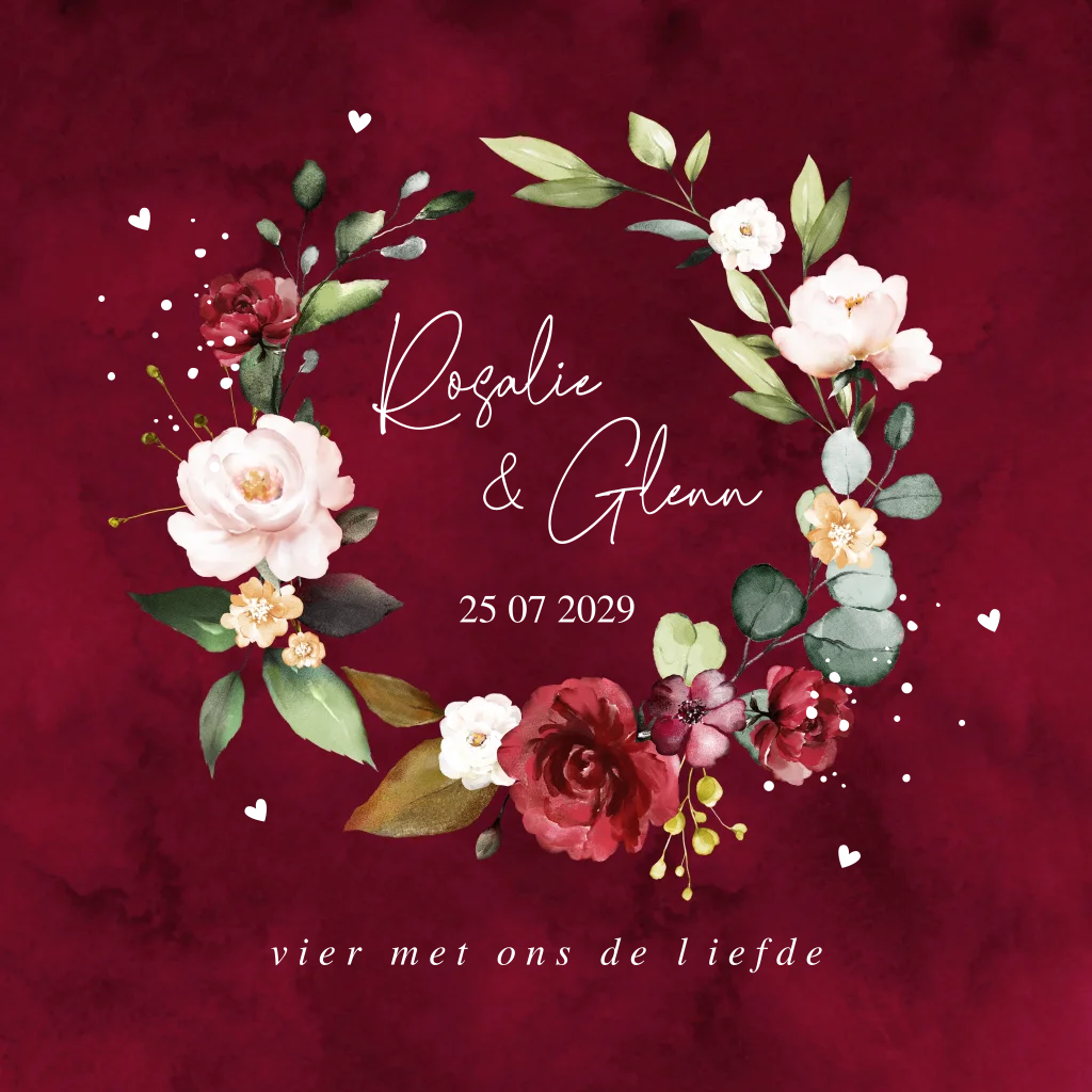 Prachtige stijlvolle trouwkaart rood met bloemenkrans en goudfolie. Vier de liefde met deze bijzondere trouwkaart!