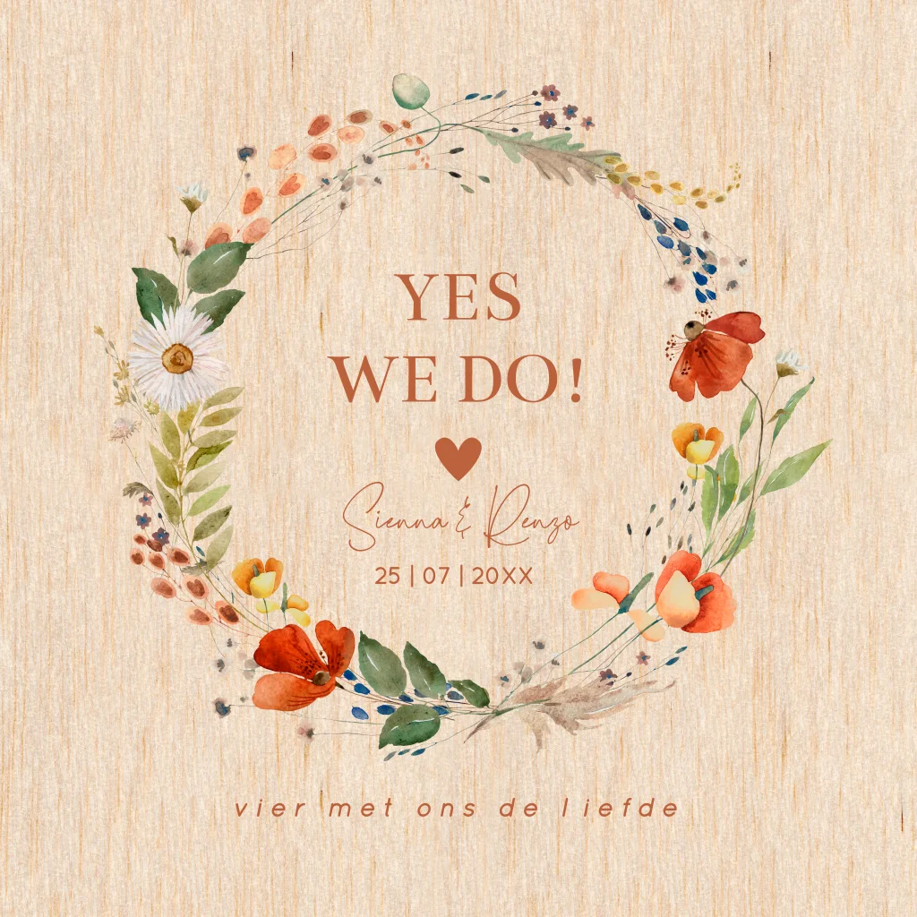Botanische trouwkaart met veldbloemen rood en houtlook (geen echt hout).