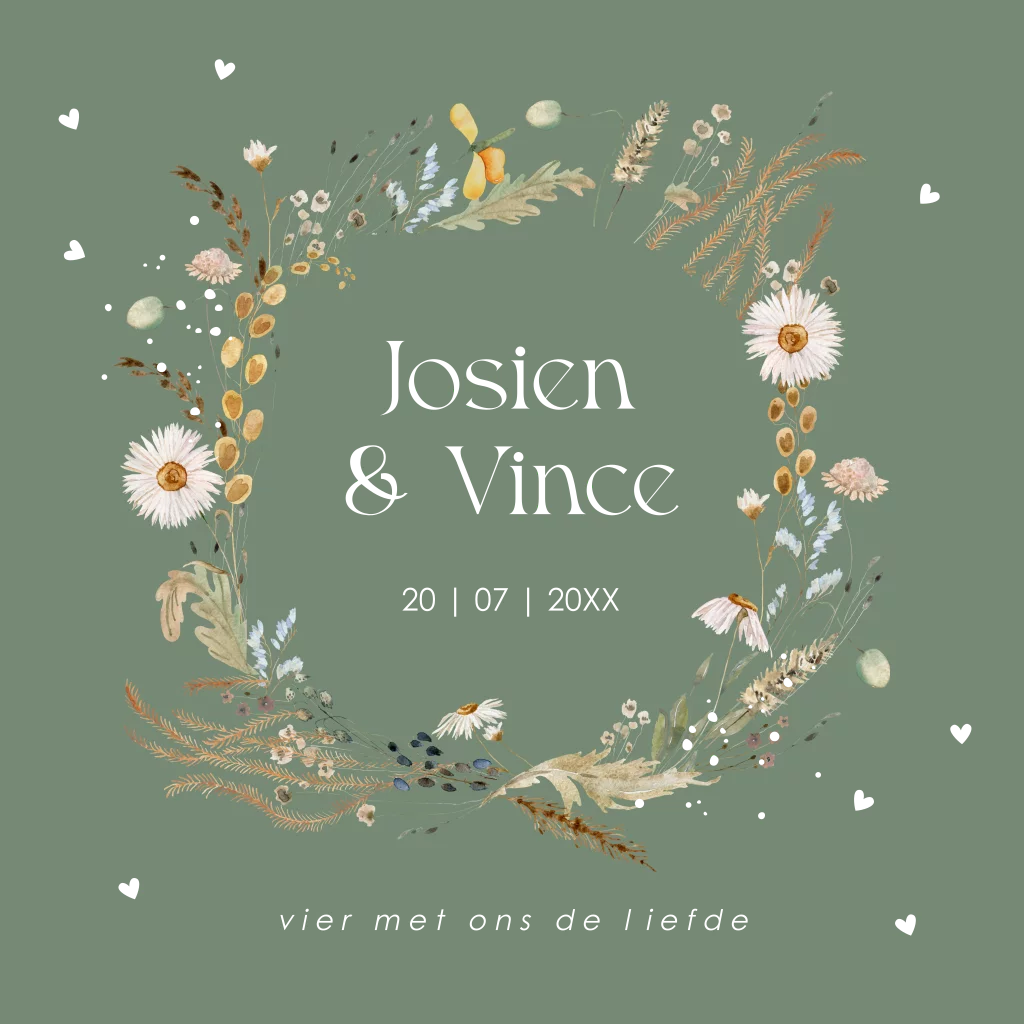 Trouwkaart groen bloemenkrans goudfolie