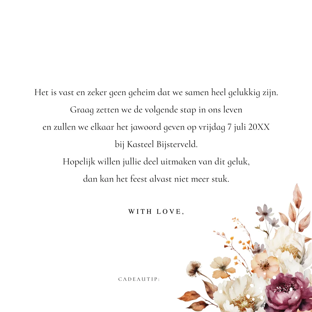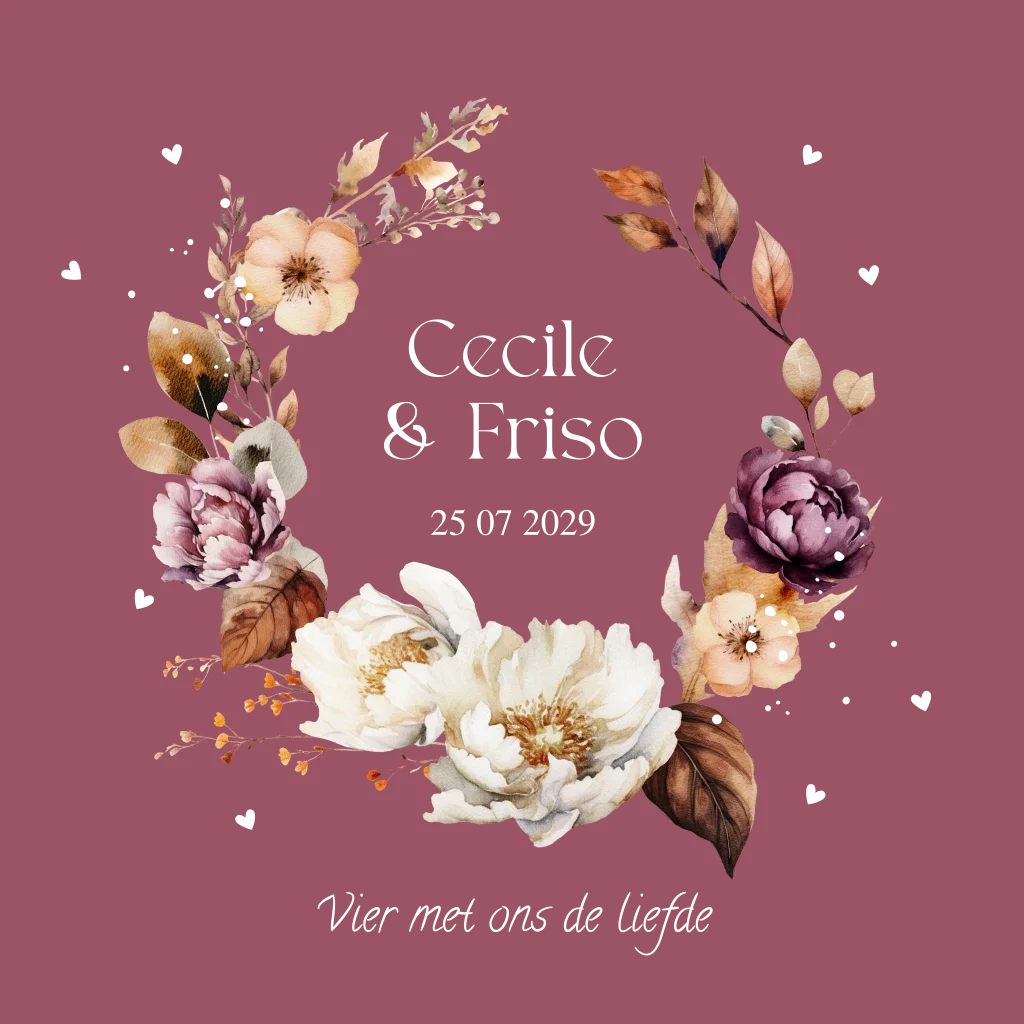 Stijlvolle trouwkaart aubergine kleur met watercolour bloemenkrans en luxe goudfolie. Nodig jullie gasten uit met deze prachtige trouwkaart met bloemen!
