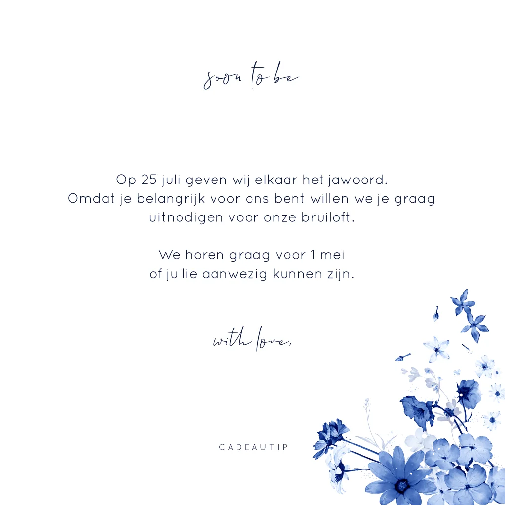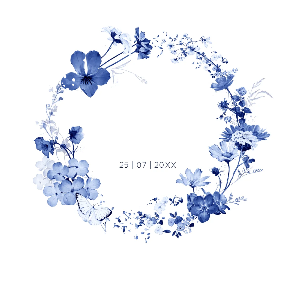 Trouwkaart blauw bloemenkrans goudfolie