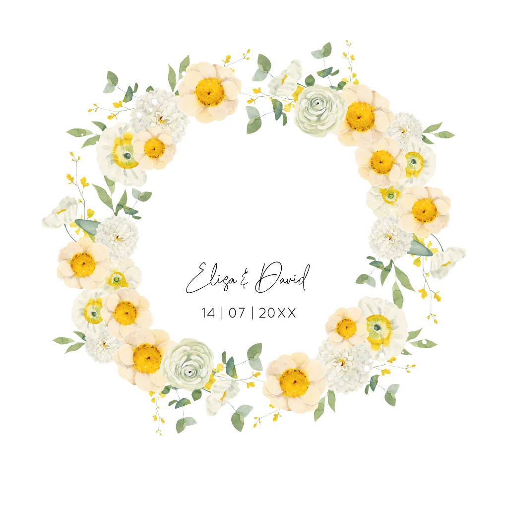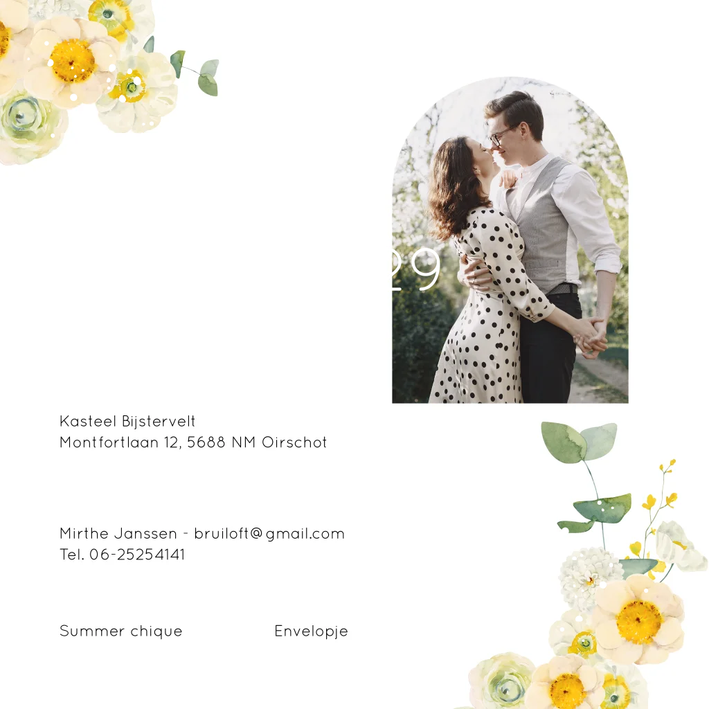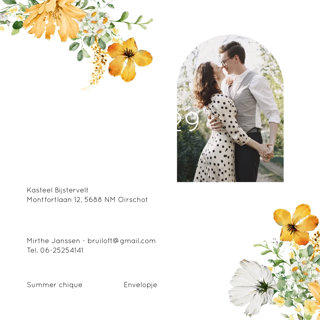 Romantische trouwkaart met mooie watercolour bloemen geel groen en goudfolie. In de binnenkant staan leuke trouw icoontjes en kan je een foto toevoegen.