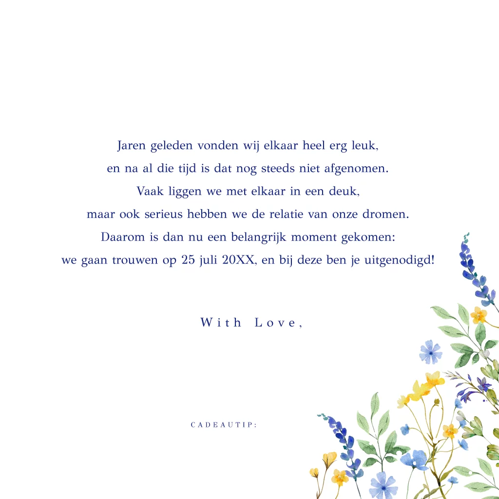 Romantische trouwkaart met mooie watercolour bloemen blauw geel en goudfolie. In de binnenkant staan leuke trouw icoontjes en kan je een foto toevoegen.