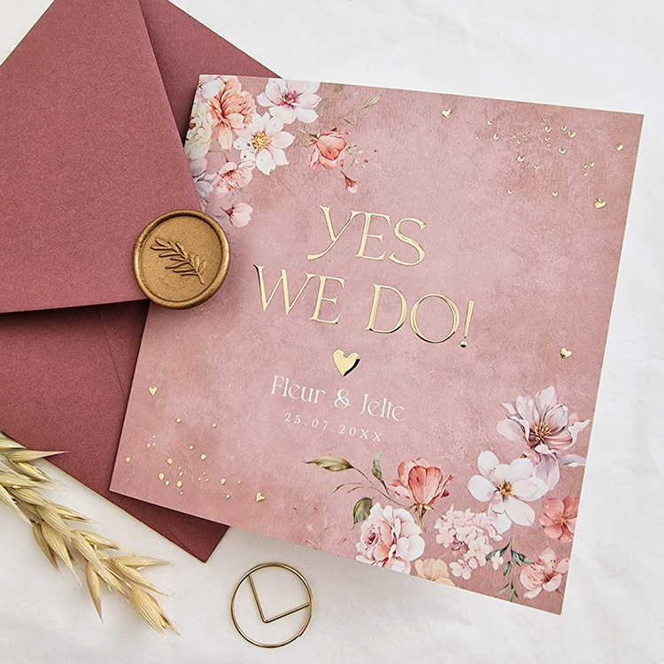 Stijlvolle unieke trouwkaart met roze watercolour bloemen en luxe goudfolie. In de binnenkant staan trouw symbooltjes en eigen foto.