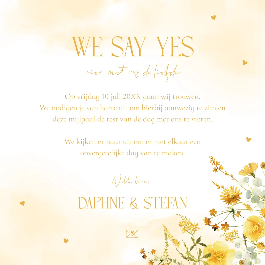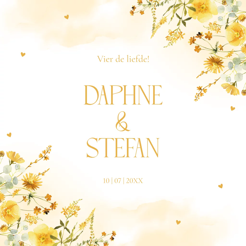 Romantische trouwkaart vierkant met watercolour bloemen geel.