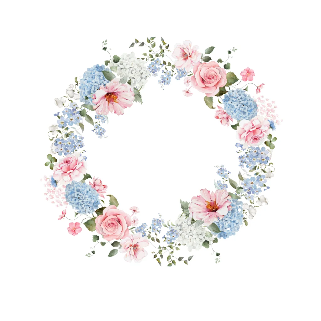 Trouwkaart bloemenkrans blauw roze rosegoudfolie