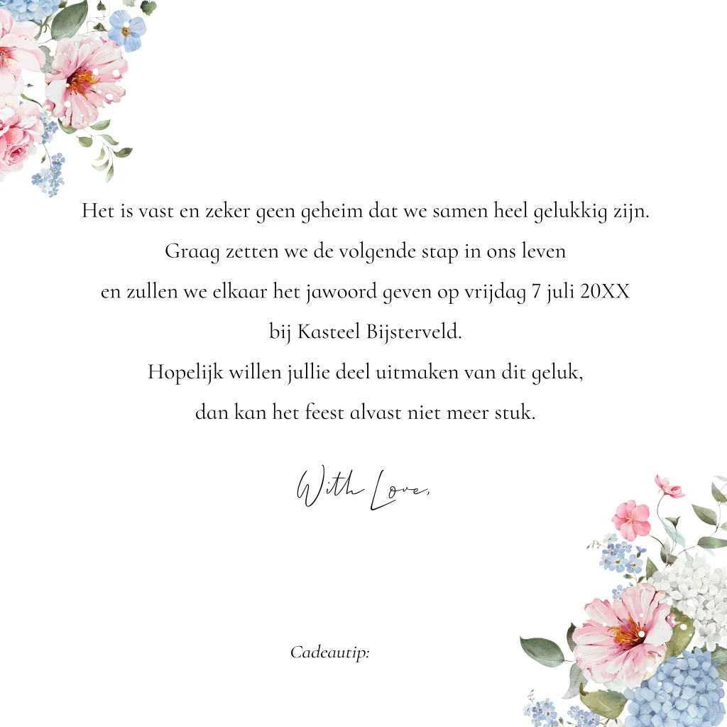 Romantische trouwkaart wit met watercolour bloemenkrans blauw roze en luxe rosegoudfolie. In de binnenkant kan je een foto toevoegen.