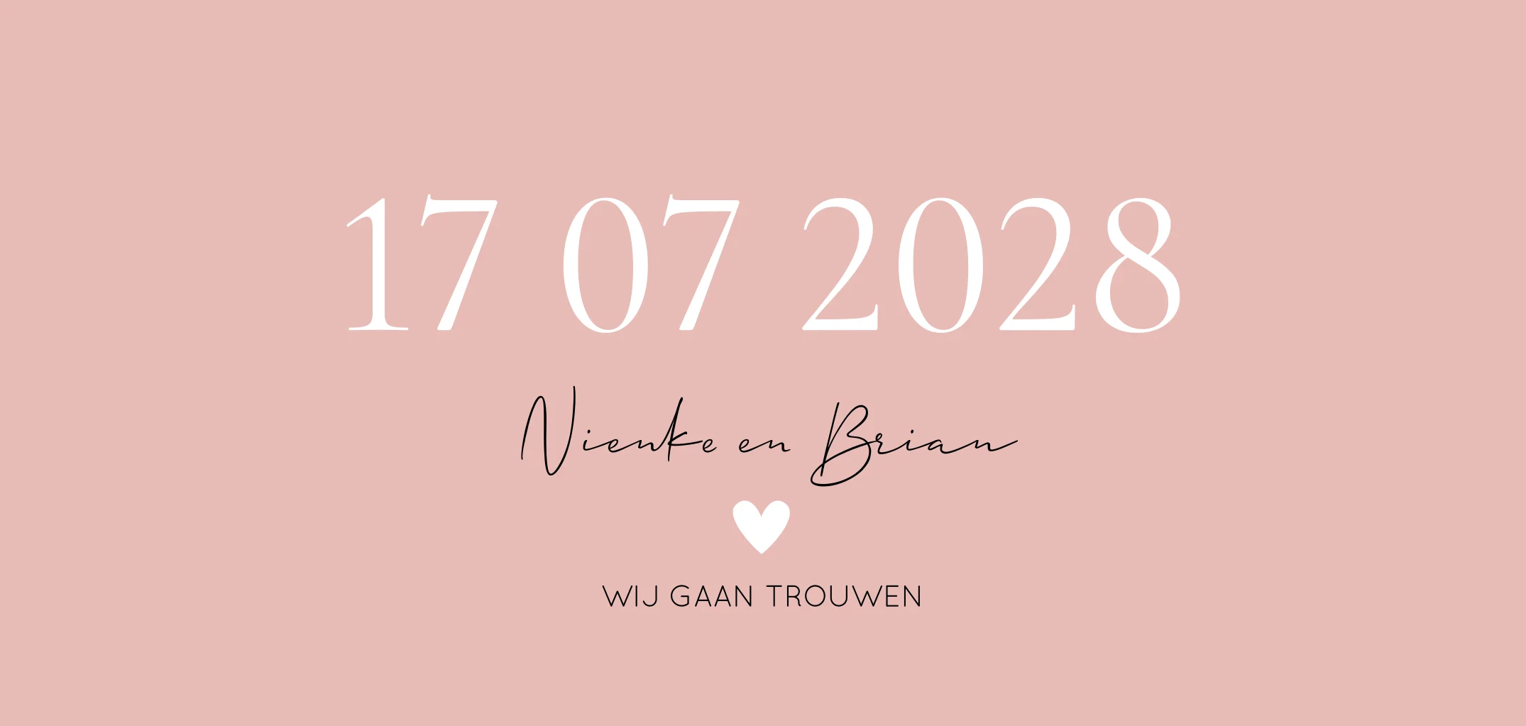 Trouwkaart modern roze met typografie datum, namen en hartje. Pas de kleuren naar wens aan.