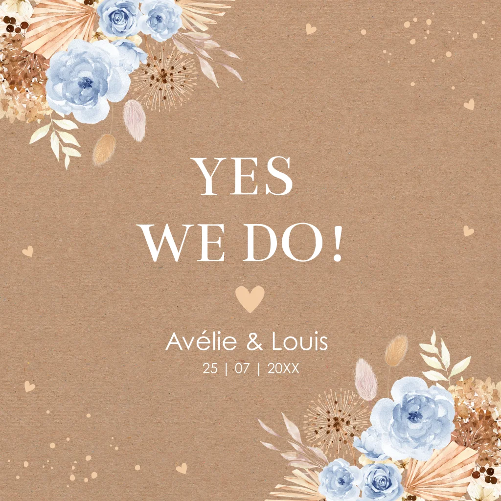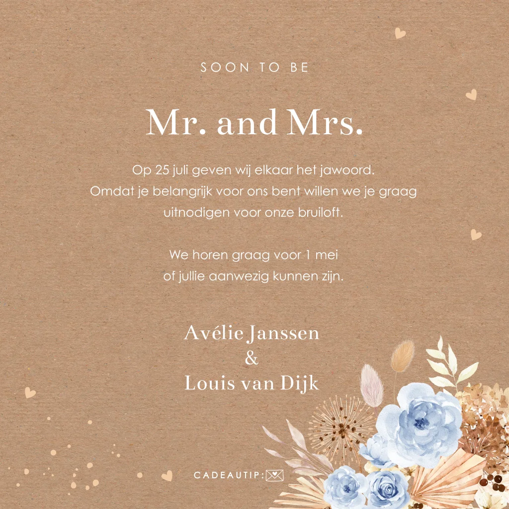 Trouwkaart bohemian bloemen blauw kraftlook