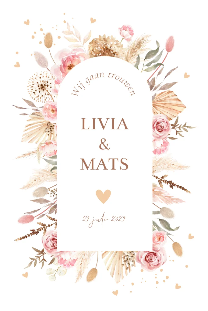 Trouwkaart geïllustreerd met mooie aquarel bloemen in bohemian thema.