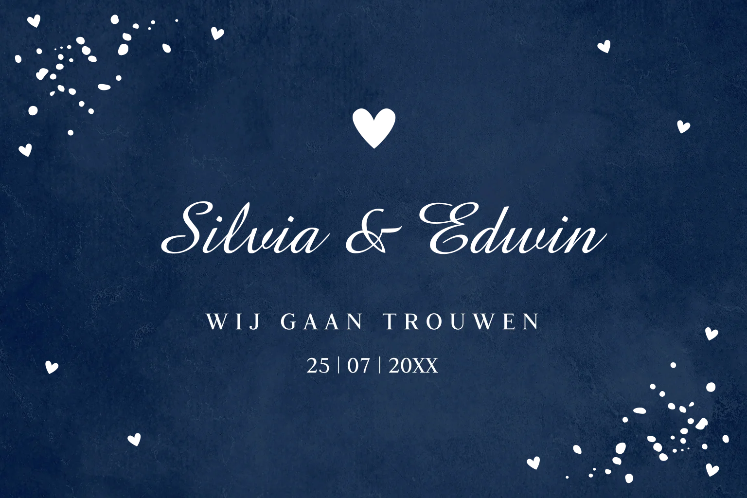 Stijlvolle trouwkaart donkerblauw met initialen naam, spetters en goudfolie. Nodig jullie gasten uit met deze elegante trouwkaart!