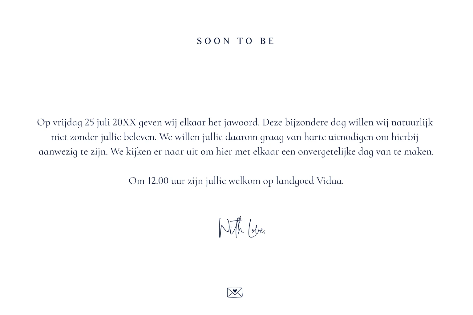 Trouwkaart donkerblauw initialen namen goudfolie rechthoekig