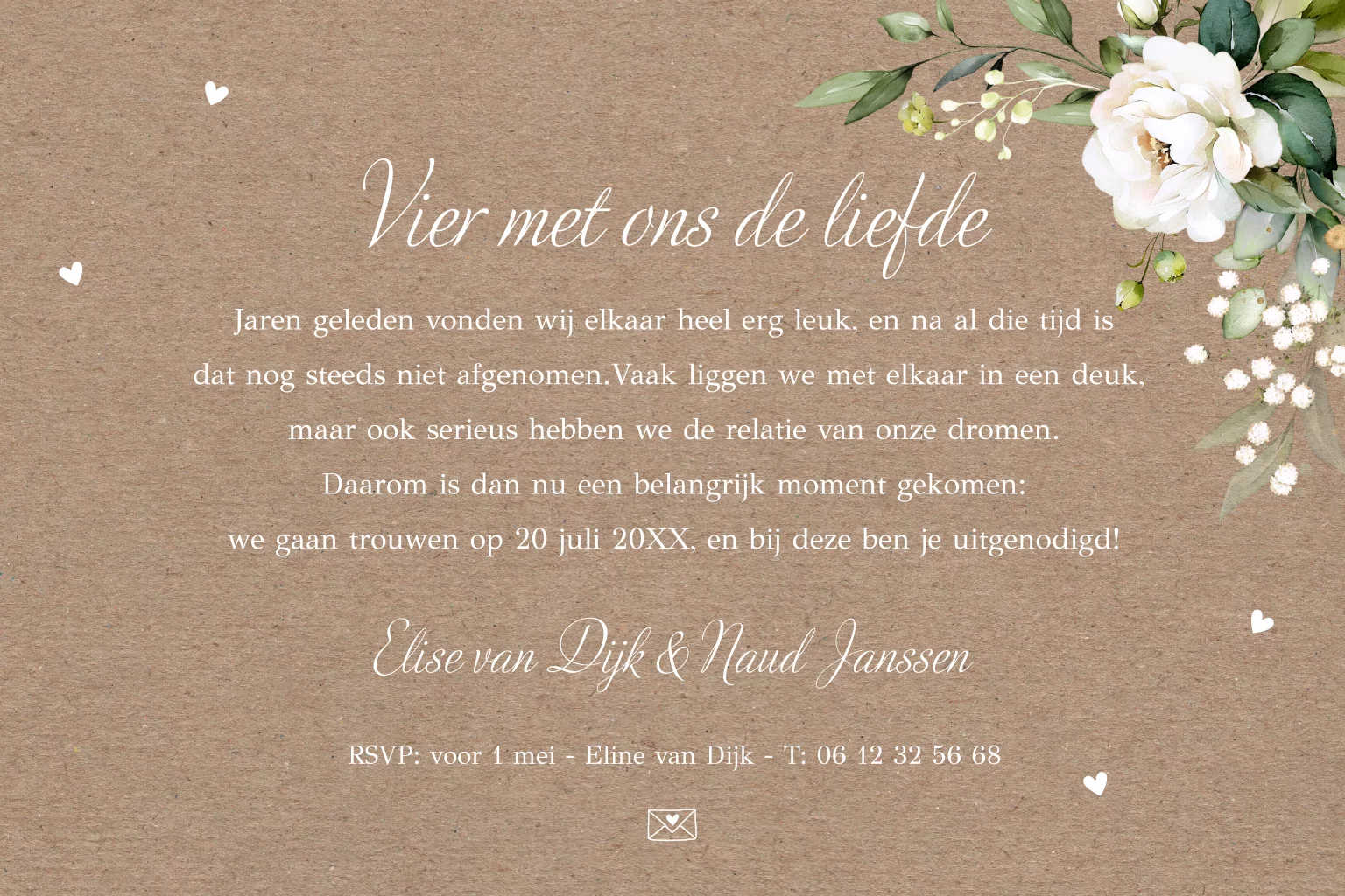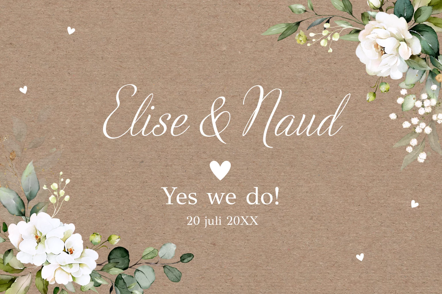 Romantische trouwkaart bruin kraftlook met witte bloemen.