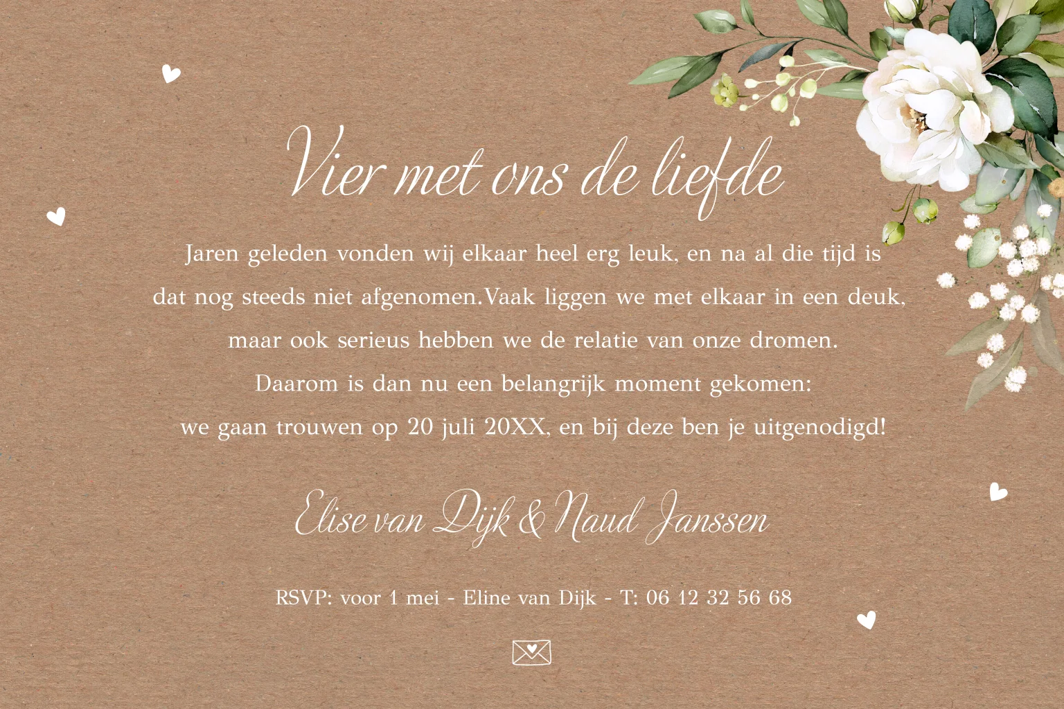 Romantische trouwkaart bruin kraftlook botanisch met witte bloemen.