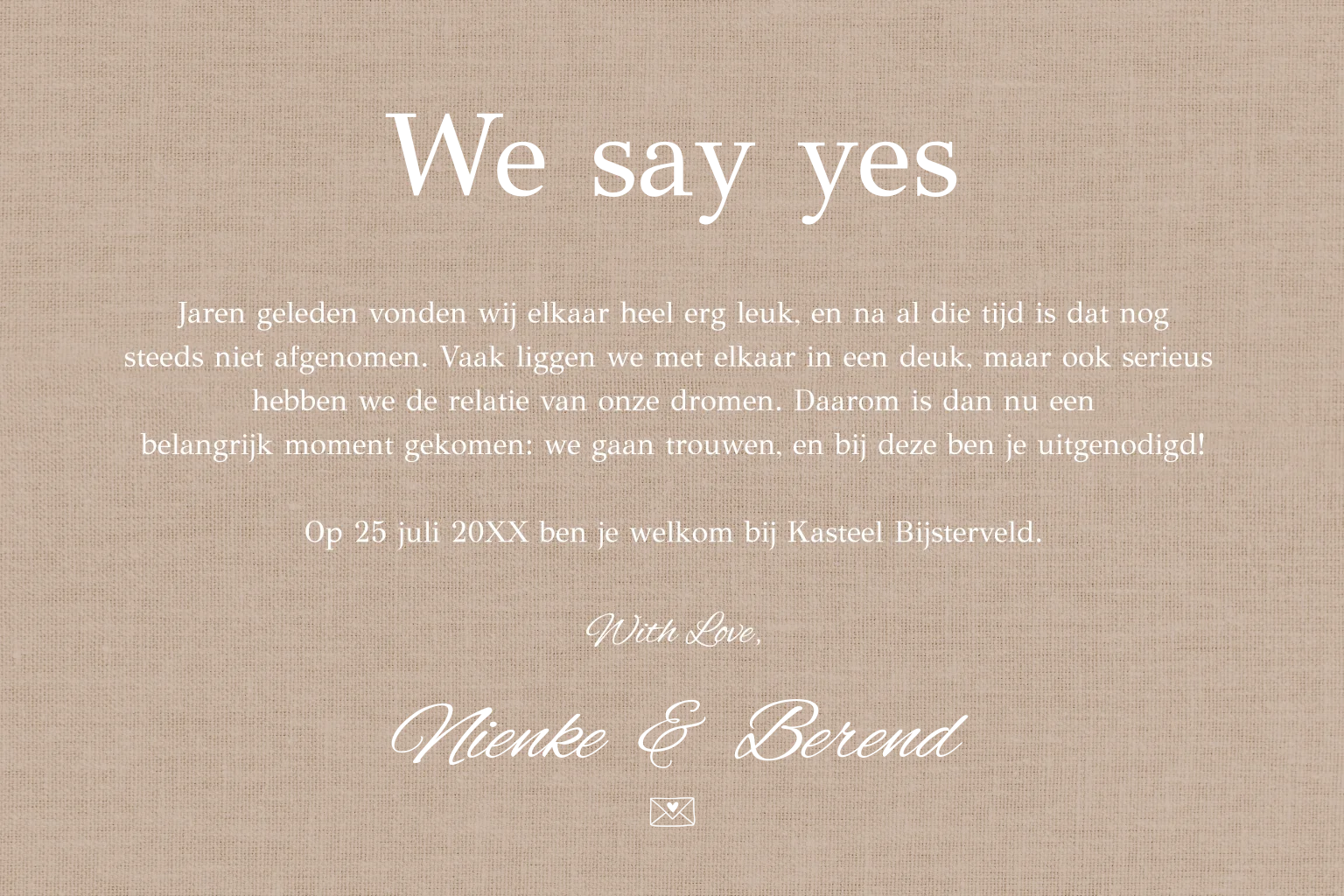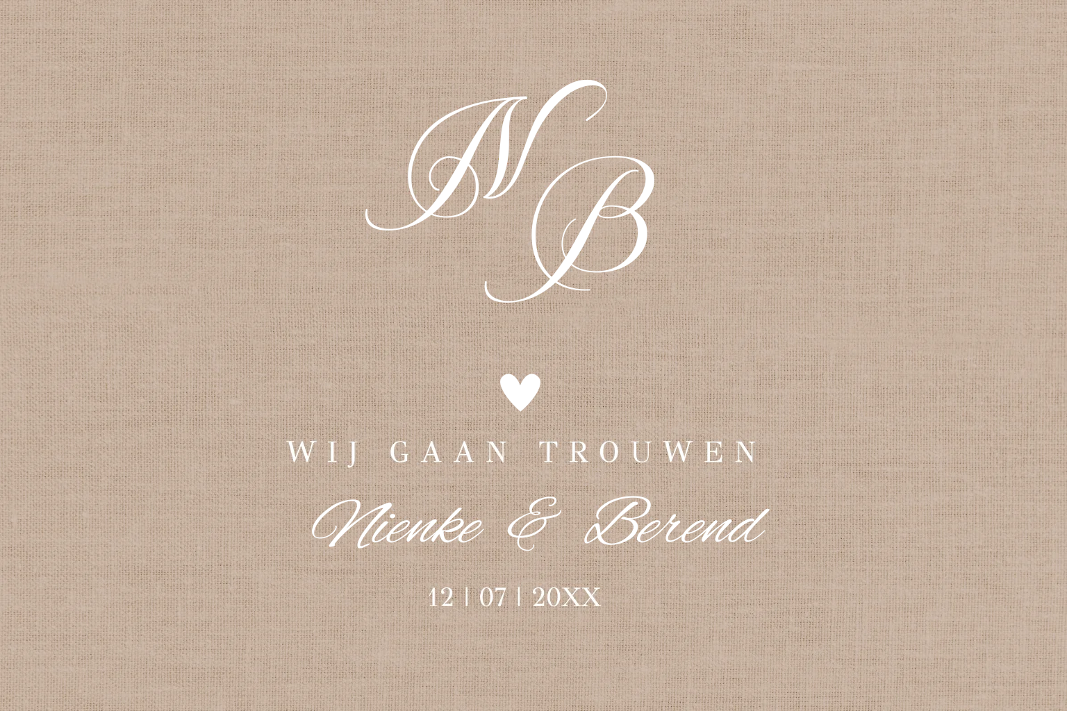 Stijlvolle trouwkaart beige met linnenlook wit en luxe goudfolie. In de binnenkant staan trouw symbolen en eigen foto.