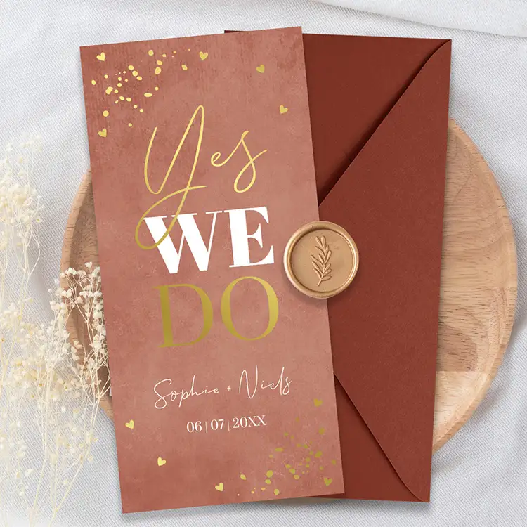 Moderne langwerpige trouwkaart roestbruin met mooie typografie en goudfolie.