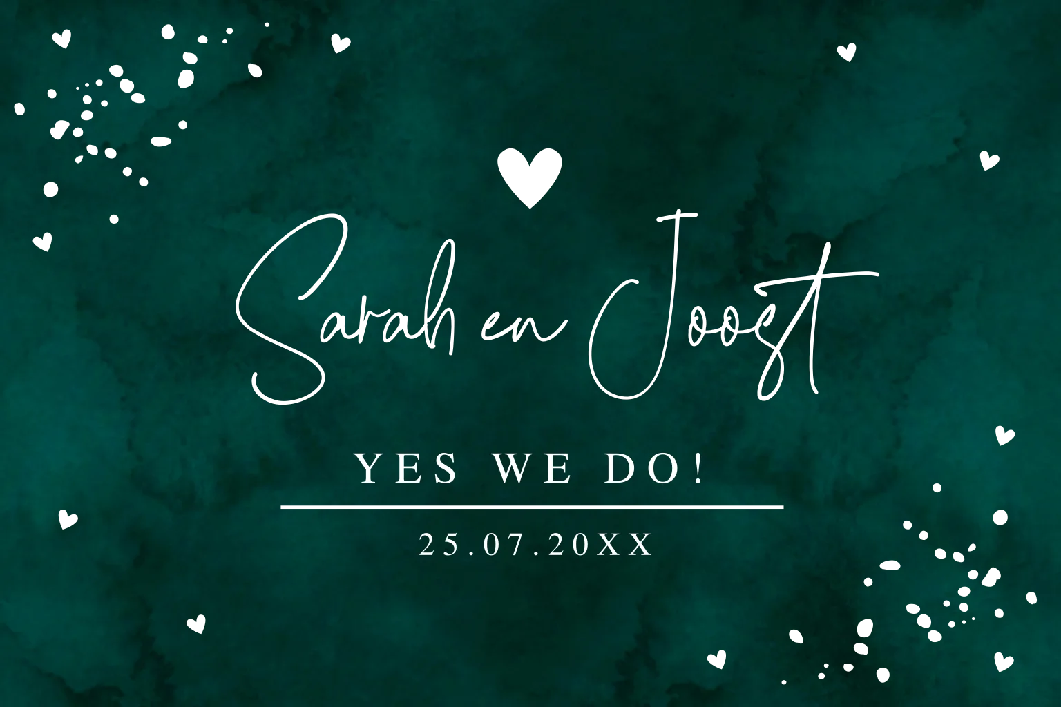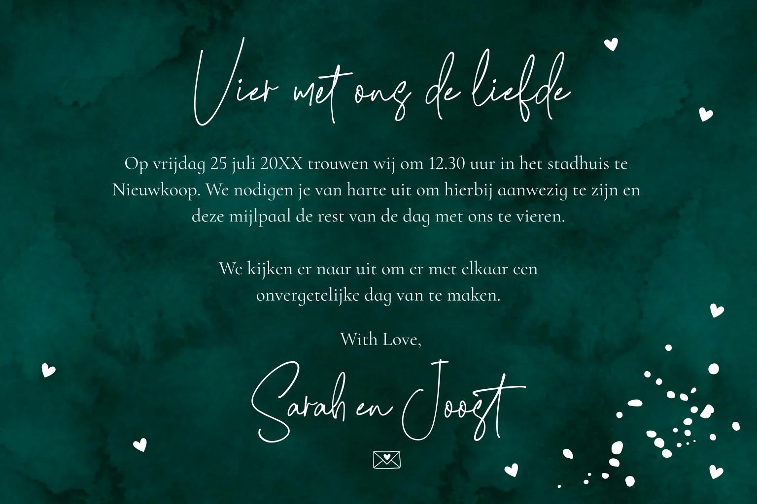 Trouwkaart donkergroen met hartjes en goudfolie. Nodig jullie gasten uit met deze stijlvolle trouwkaart.