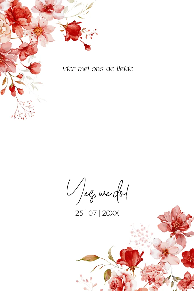 Stijlvolle trouwkaart met bloemen rood en goudfolie. Nodig jullie gasten uit met deze prachtige trouwkaart.