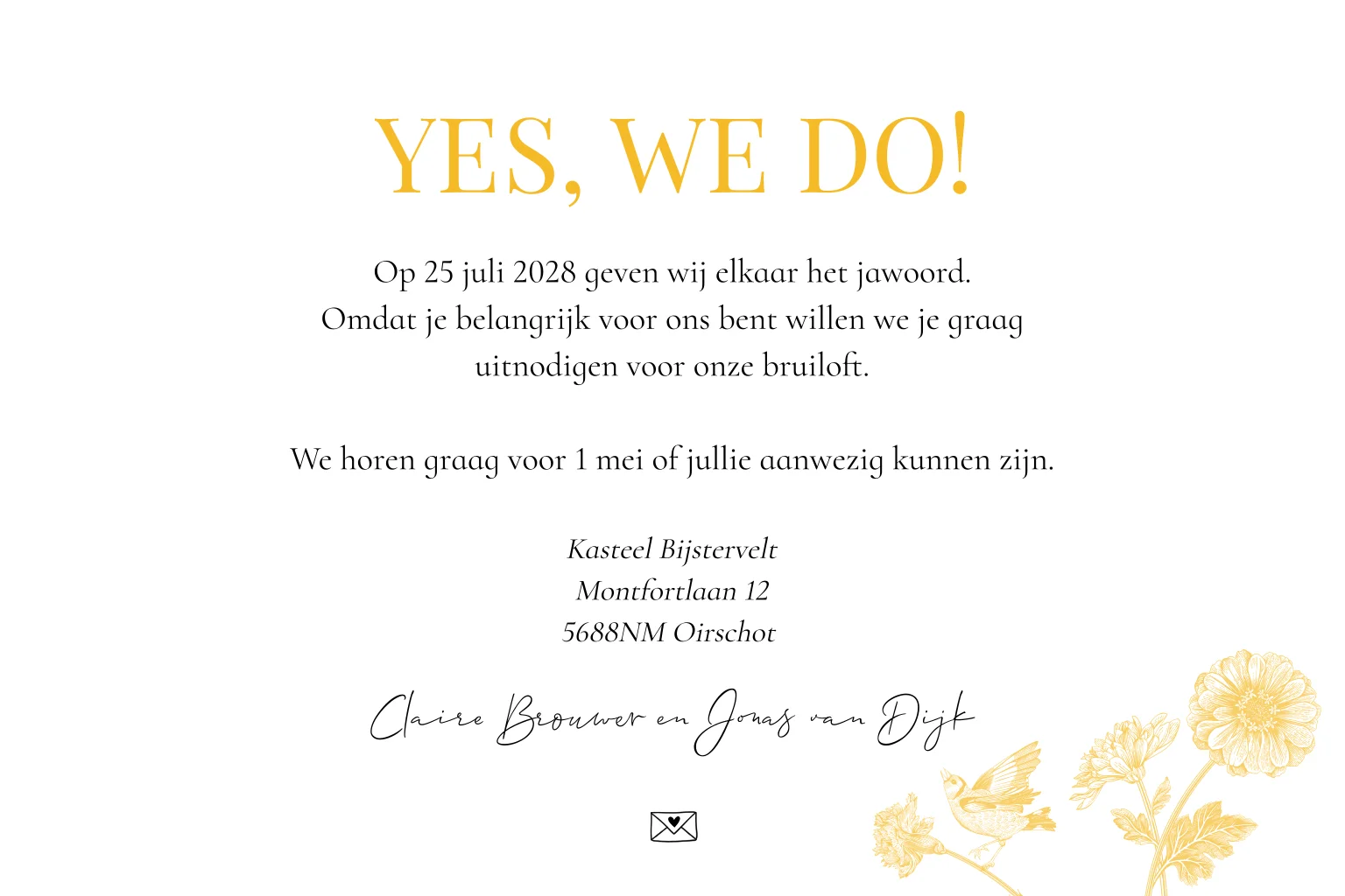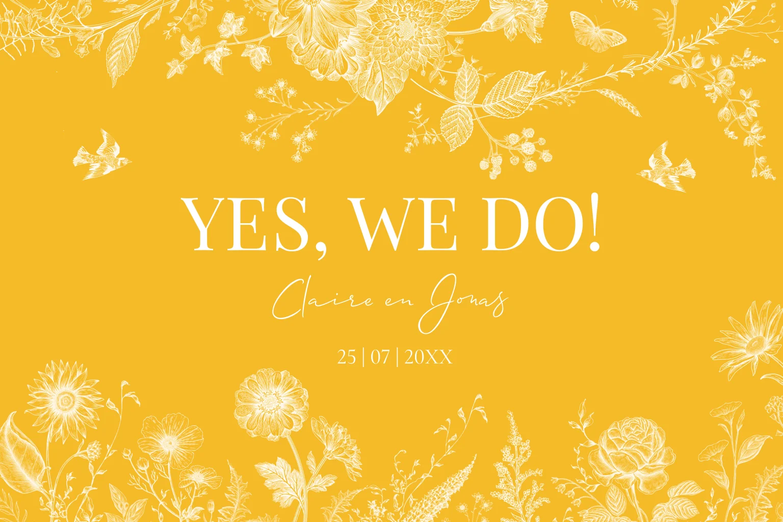Trouwkaart geel botanisch bloemen bladeren vogels