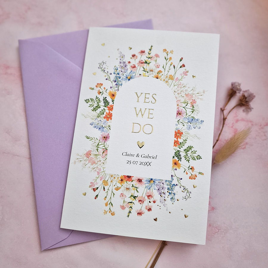Romantische originele trouwkaart rechthoekig wit met krans van fel gekleurde bloemen in boog vorm en luxe goudfolie.