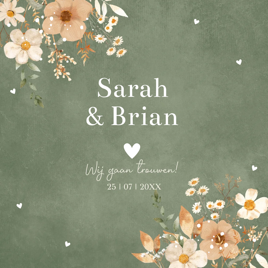 Originele stijlvolle trouwkaart groen met beige watercolour bloemen en luxe folie. Nodig jullie gasten uit met deze romantische trouwkaart.