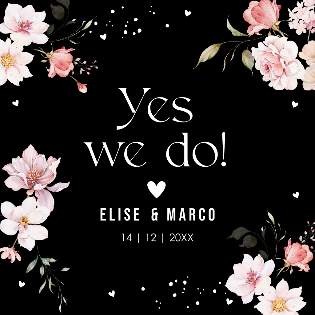 Trouwkaart zwart met roze bloemen en rosegoudfolie. In de binnenkant is ruimte voor een foto en staan leuke trouw symbolen.
