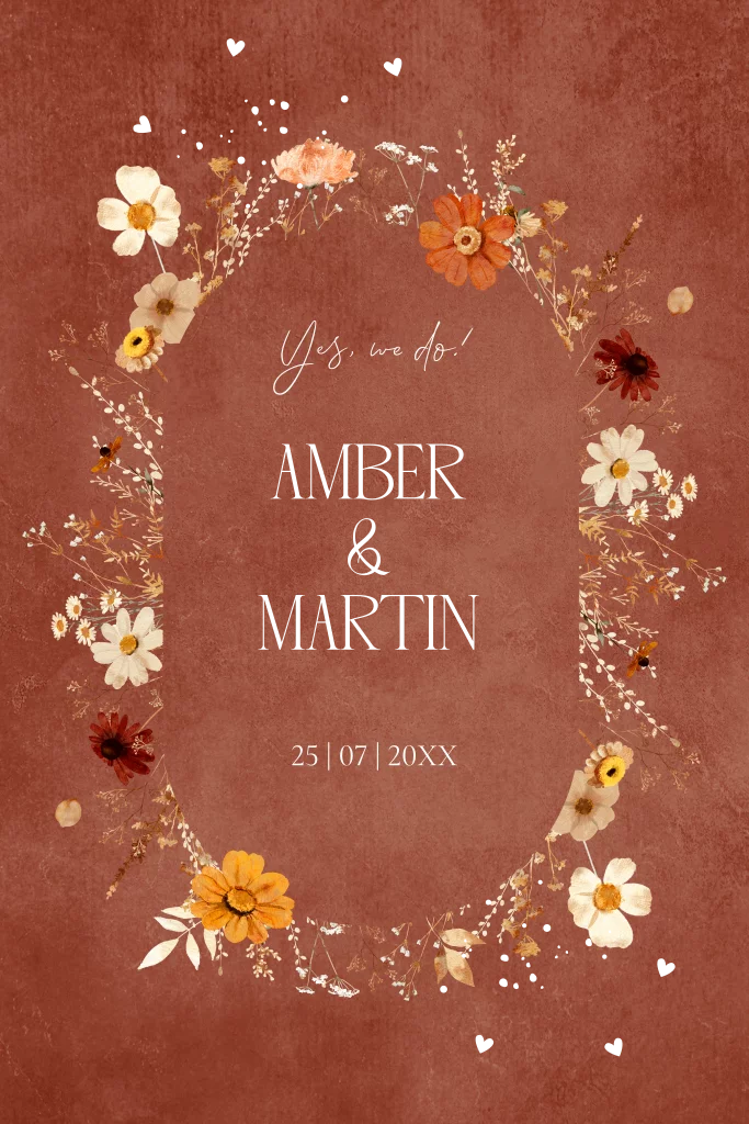 Trouwkaart bloemen terracotta roestbruin goudfolie