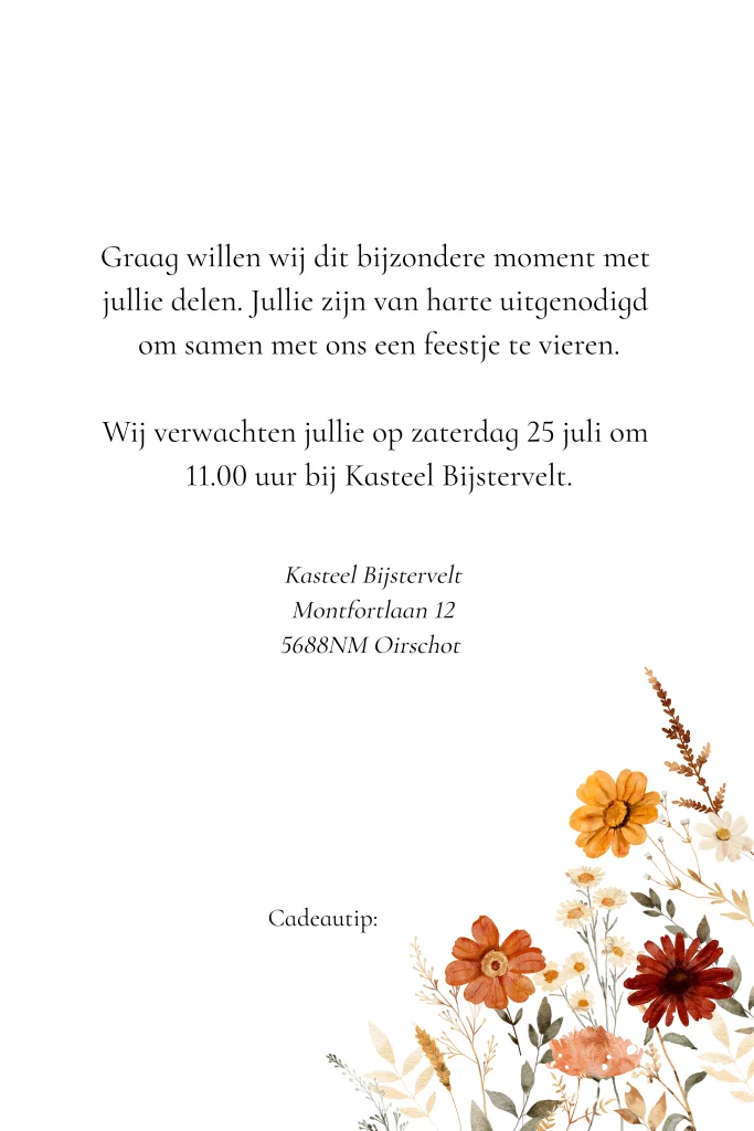 Trouwkaart met aquarel bloemen in herfst kleuren bruin rood en goudfolie. Nodig jullie gasten uit met deze mooie unieke trouwkaart!