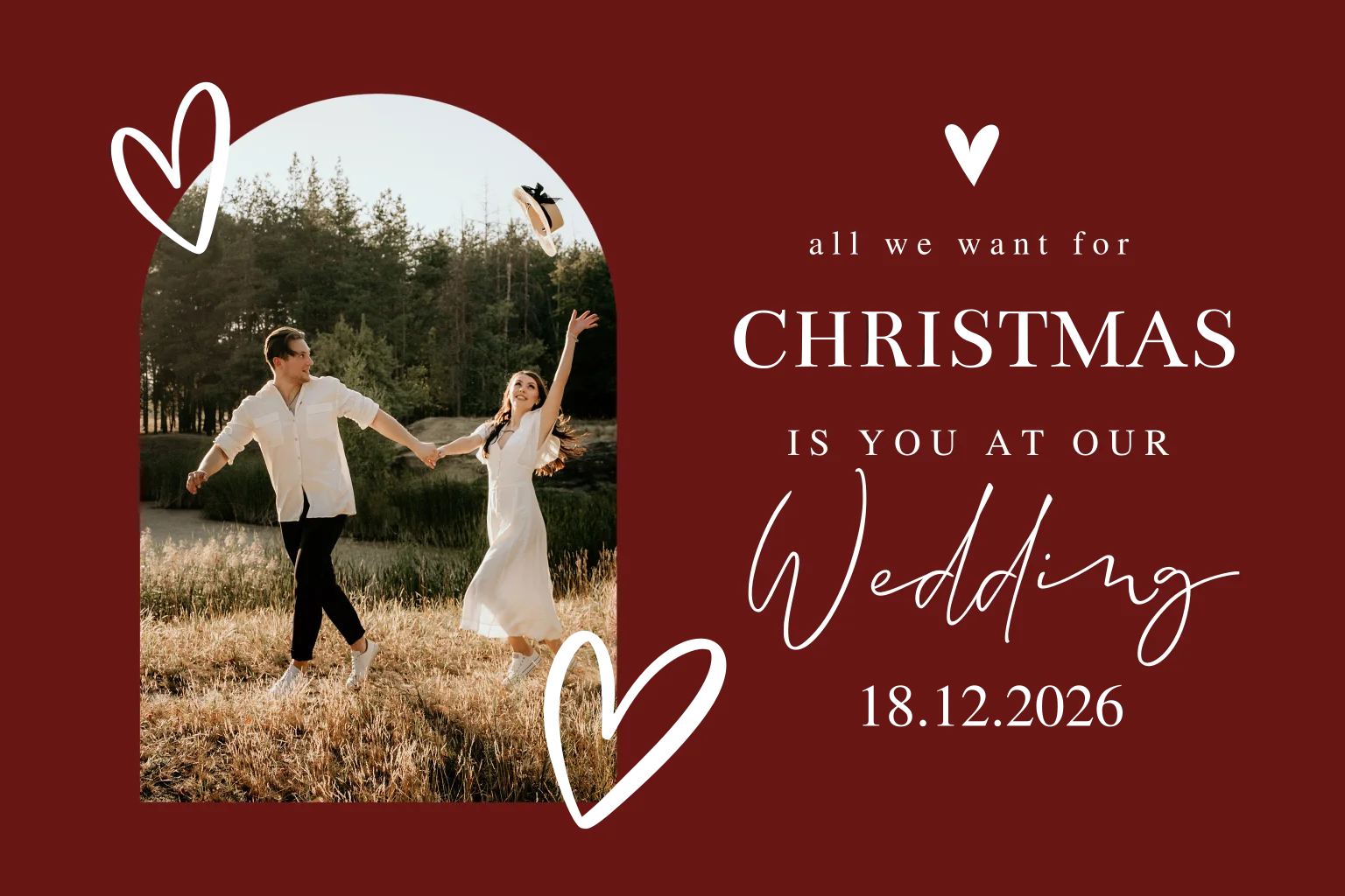 Kerst trouwkaart rood met foto in boog vorm, hartjes en goudfolie. Kies voor deze mooie luxe trouw en kerstkaart in één!